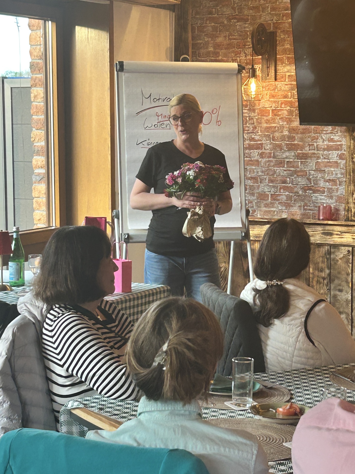 Carolin Goletz berichtete praxisnah aus dem Leben und verglich Ihre Erfahrungen mit den Erlebnissen und der Meinung der Zuhörerschaft. Die Trainerin und Coachin im Bereich Kommunikation, Vertrieb und Persönlichkeitsentwicklung berichtete nicht auf der abstrakten Ebene der Theorien. Im Mittelpunkt stand der Alltag mit seinen großen und kleinen zwischenmenschlichen Herausforderungen. Die Referentin lieferte dazu gute Impulse und kleine einfache Tipps, wie z. B. das "aber" durch "und" zu ersetzen. Somit mildere man die Einschränkung, Entwertung und Ablehnung des Wörtchens "aber" und erzeuge im gegenüber durch "und" keine reaktive Abwehrhaltung, erklärte Carolin Goletz.