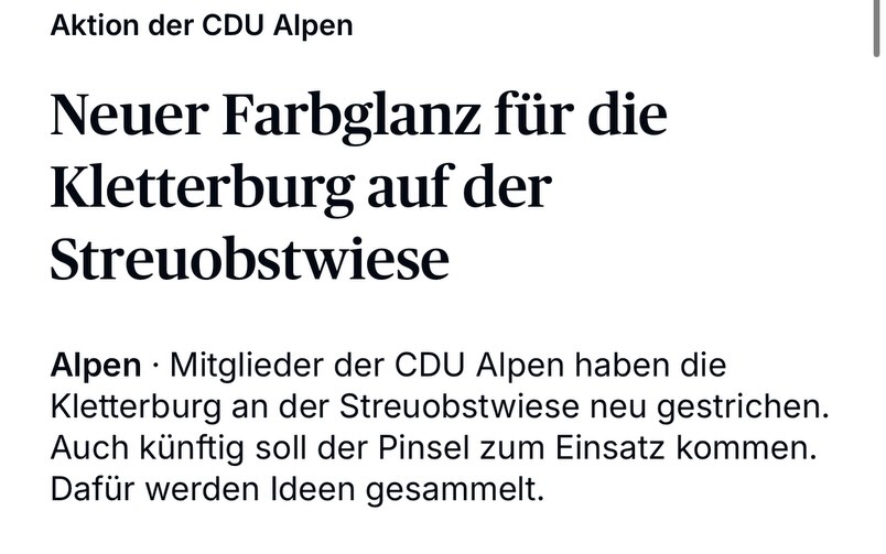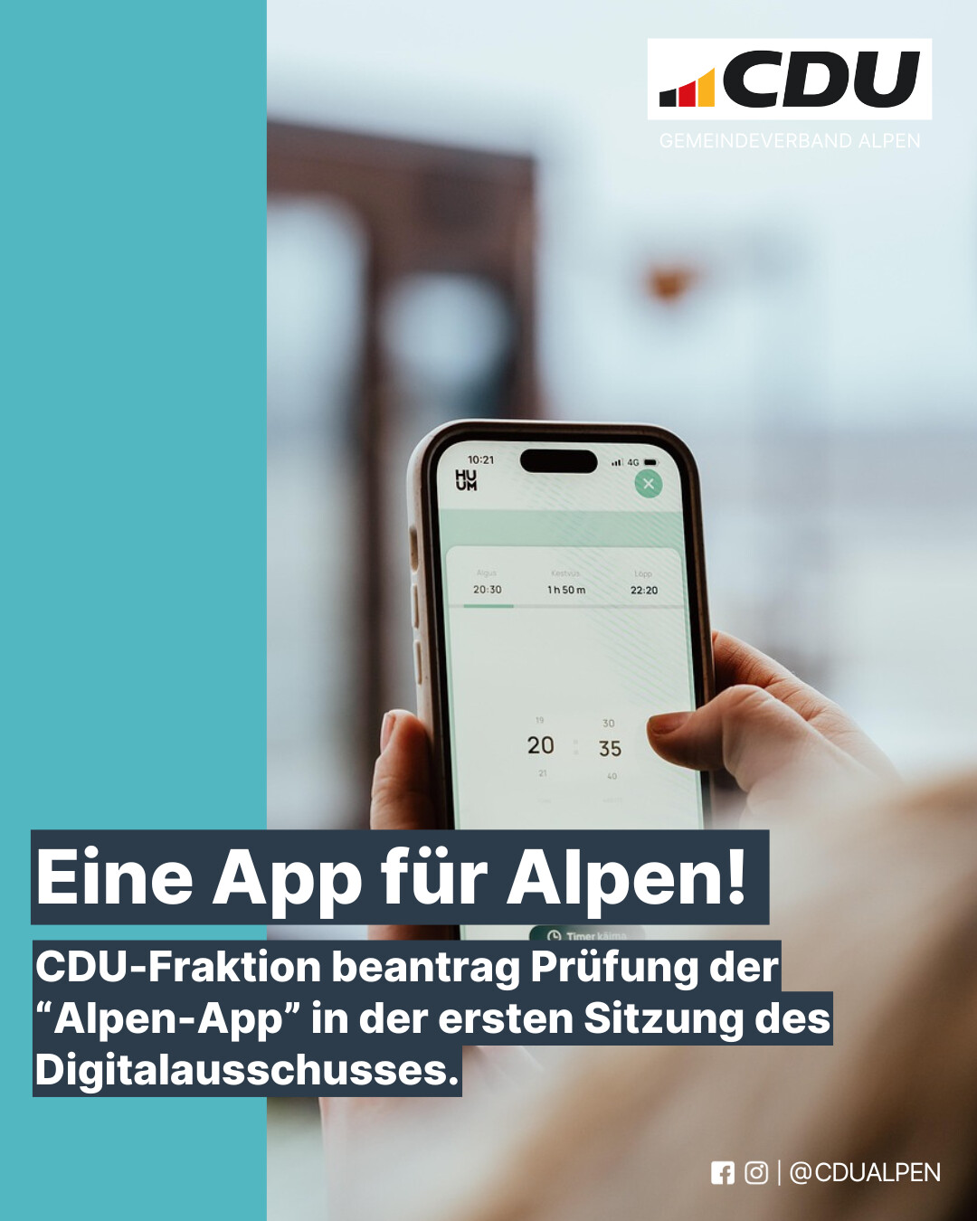 📱 Eine App für Alpen!Ein nächster Schritt und wichtiger Baustein zur Umsetzung unseres Wahlprogramms:Die CDU-Fraktion setzt sich für eine moderne, bürgernahe und digitale Gemeinde ein. Deshalb haben wir beantragt, in der ersten Sitzung des Digitalisierungsausschusses die Prüfung einer "Alpen-App" auf den Weg zu bringen.👉 Ziel ist es, zentrale Informationen und Services zu bündeln ? von Veranstaltungen über Push-Nachrichten bis hin zu digitalen Angeboten für den Alltag.Wir wollen wissen:✔️ Welche Funktionen sind sinnvoll?✔️ Welche Kosten entstehen?✔️ Welche Lösungen haben sich anderswo bewährt?Digitalisierung soll den Alltag der Menschen in Alpen einfacher, transparenter und näher machen. 🚀📄 Der Antrag ist auf unserer Homepage einsehbar. https://www.cdu-alpen.de/image/daten/news_20260123174616_antrag_alpen_app_final.pdf📘 Zum Wahlprogramm:https://www.cdu-alpen.de/image/daten/news_20250717154922_26_alp_wahlprogramm_v1.pdf